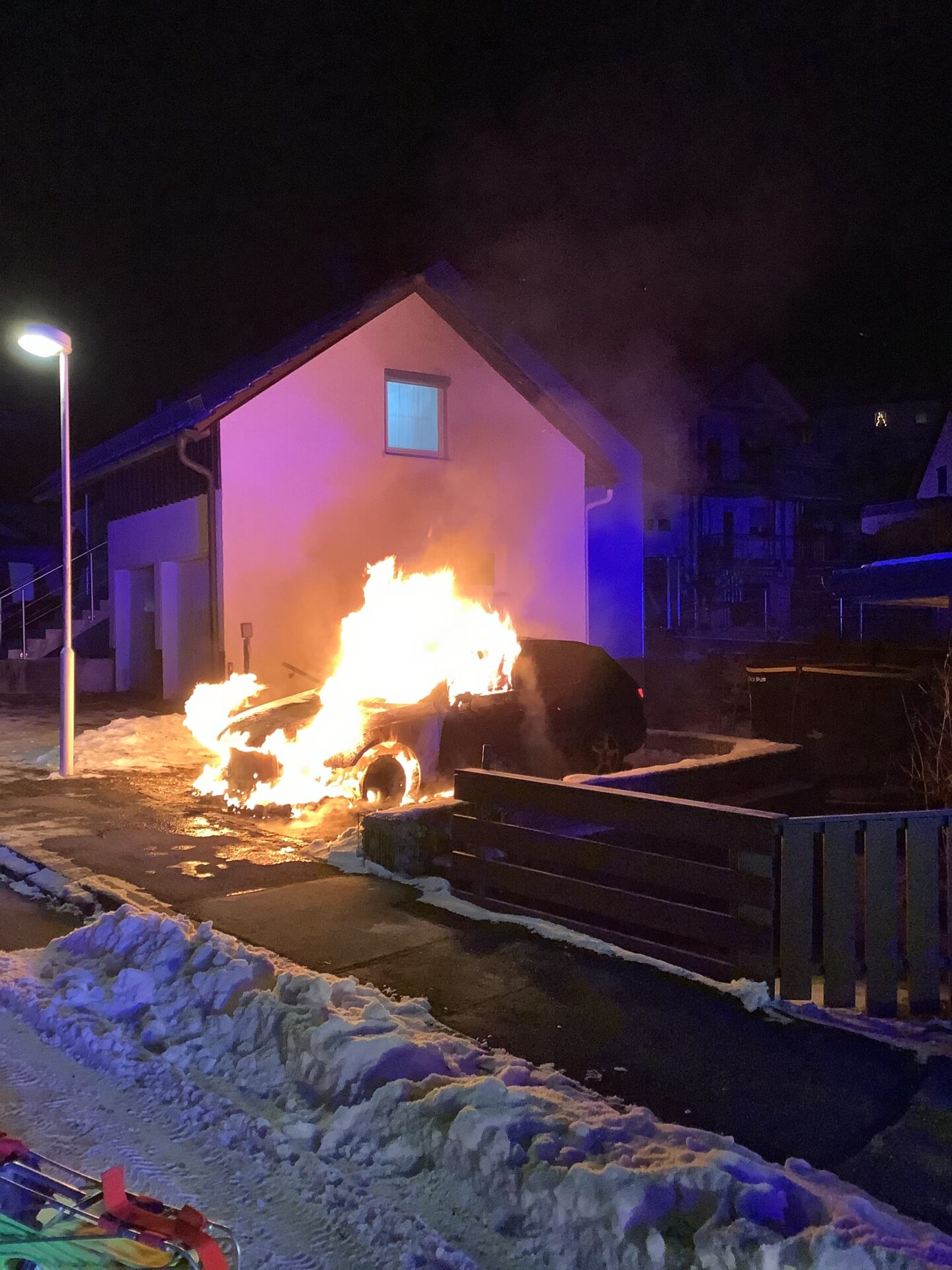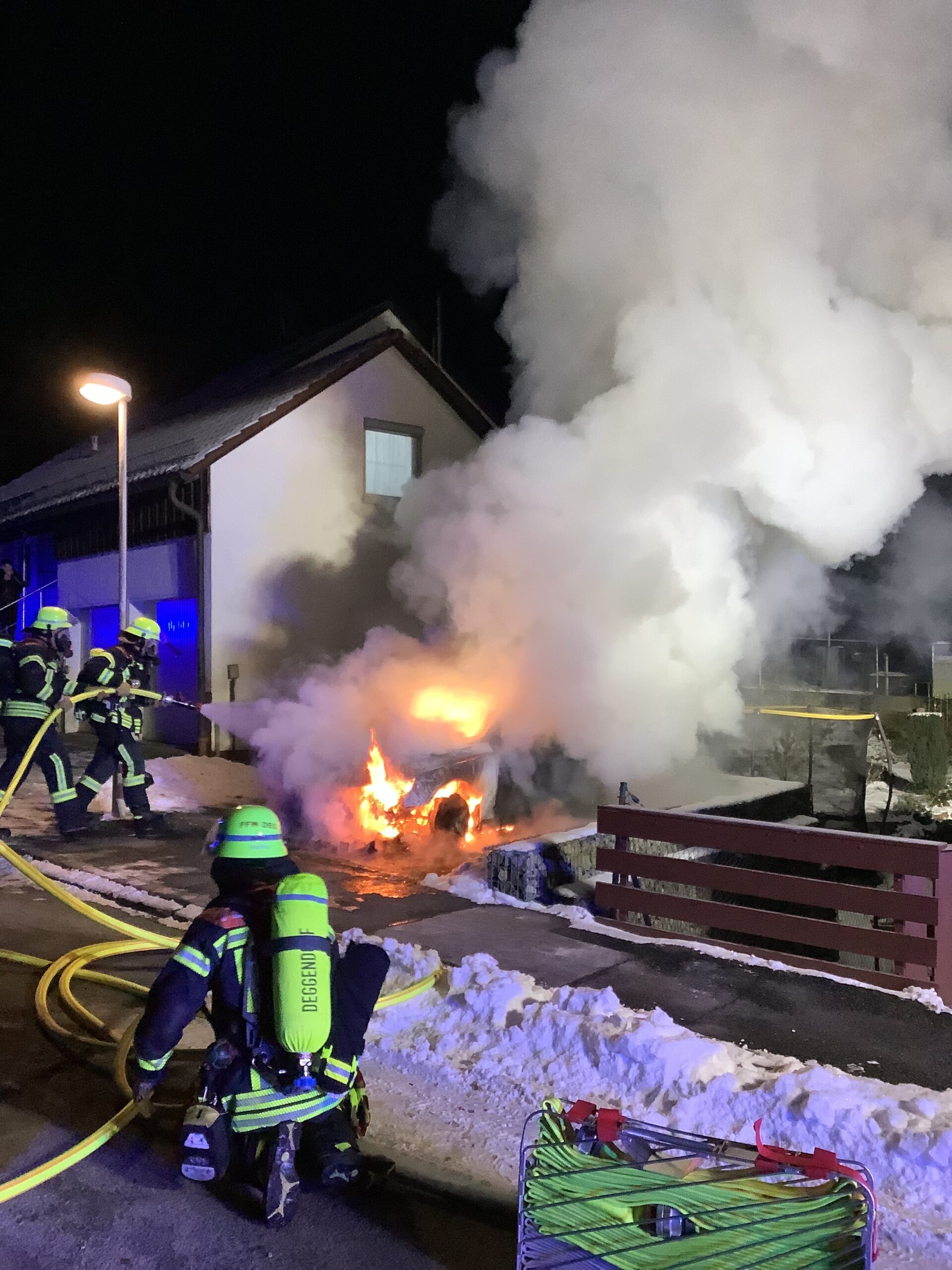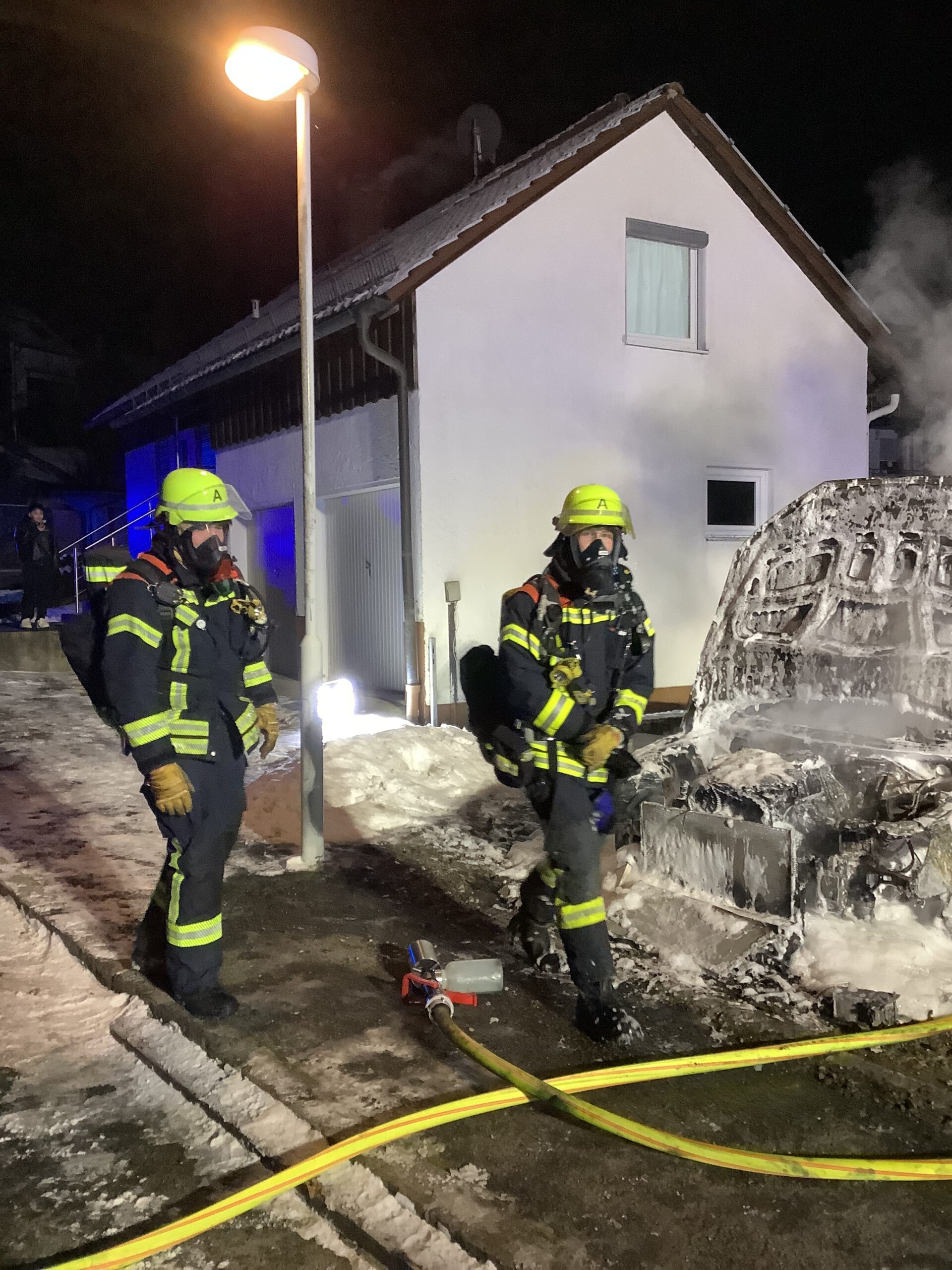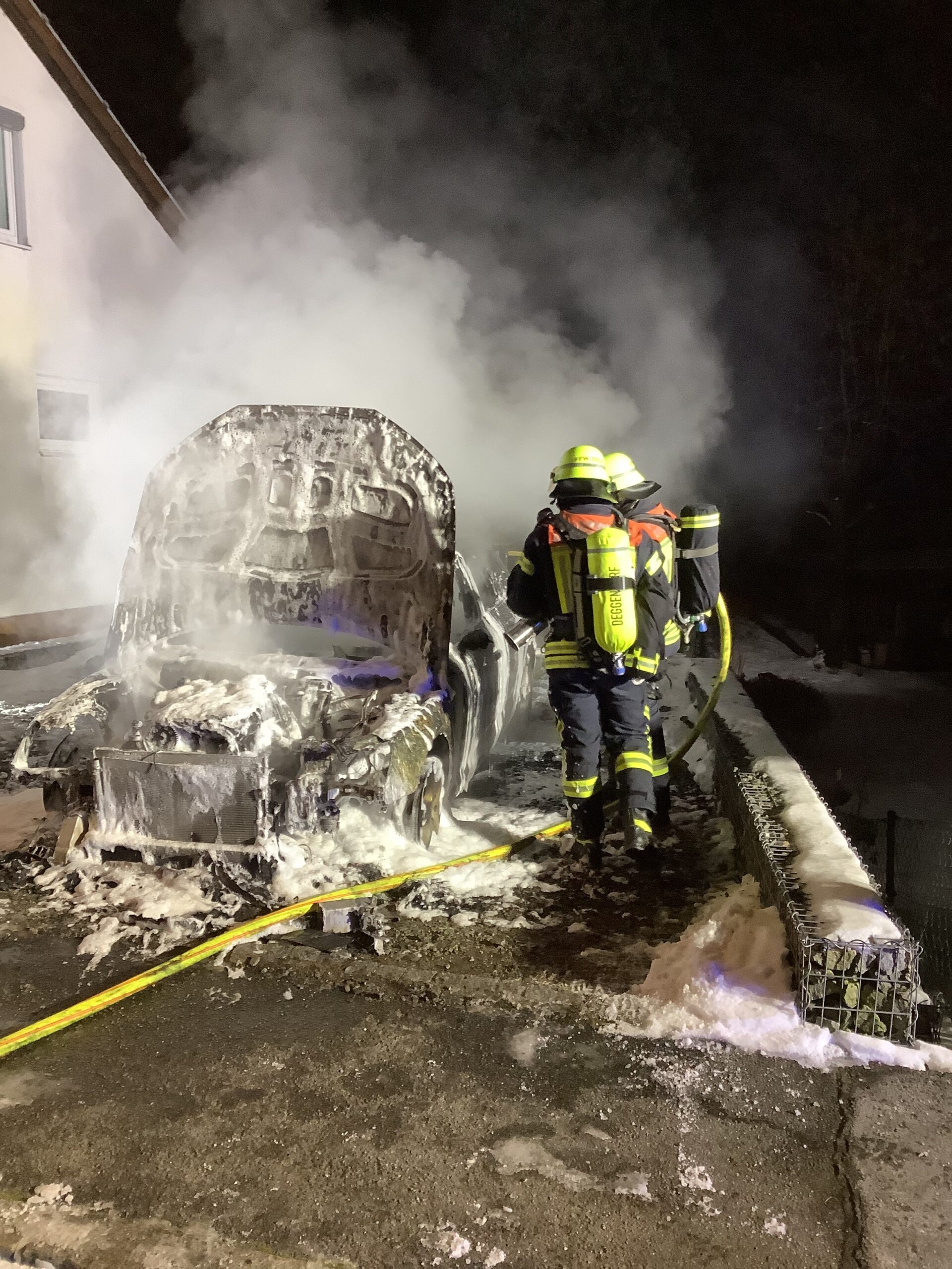 Der Motor und der Innenraum eines Fahrzeugs standen im Vollbrand. Dem Löschwasser wurde Schaum beigemischt, um die Glut zu ersticken.