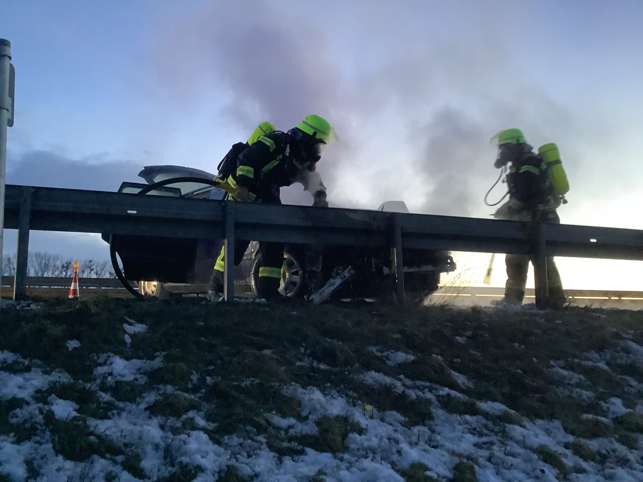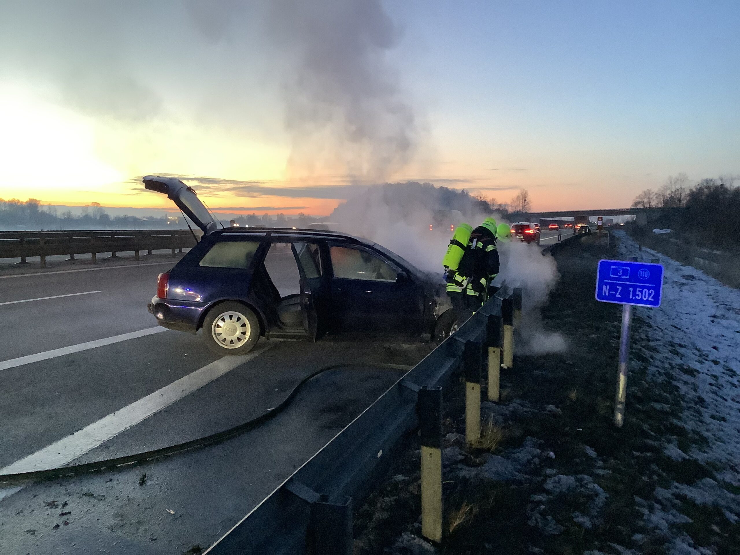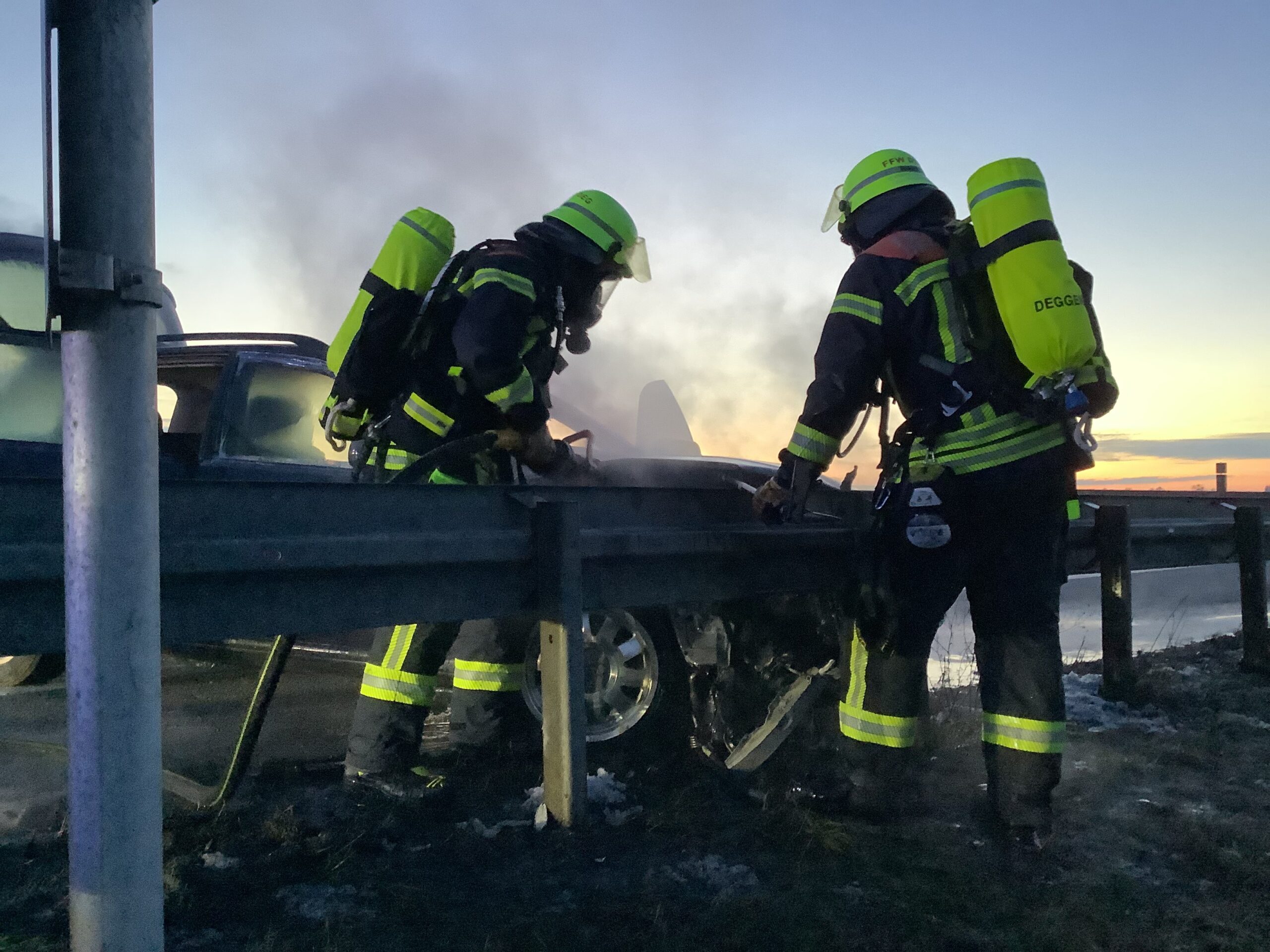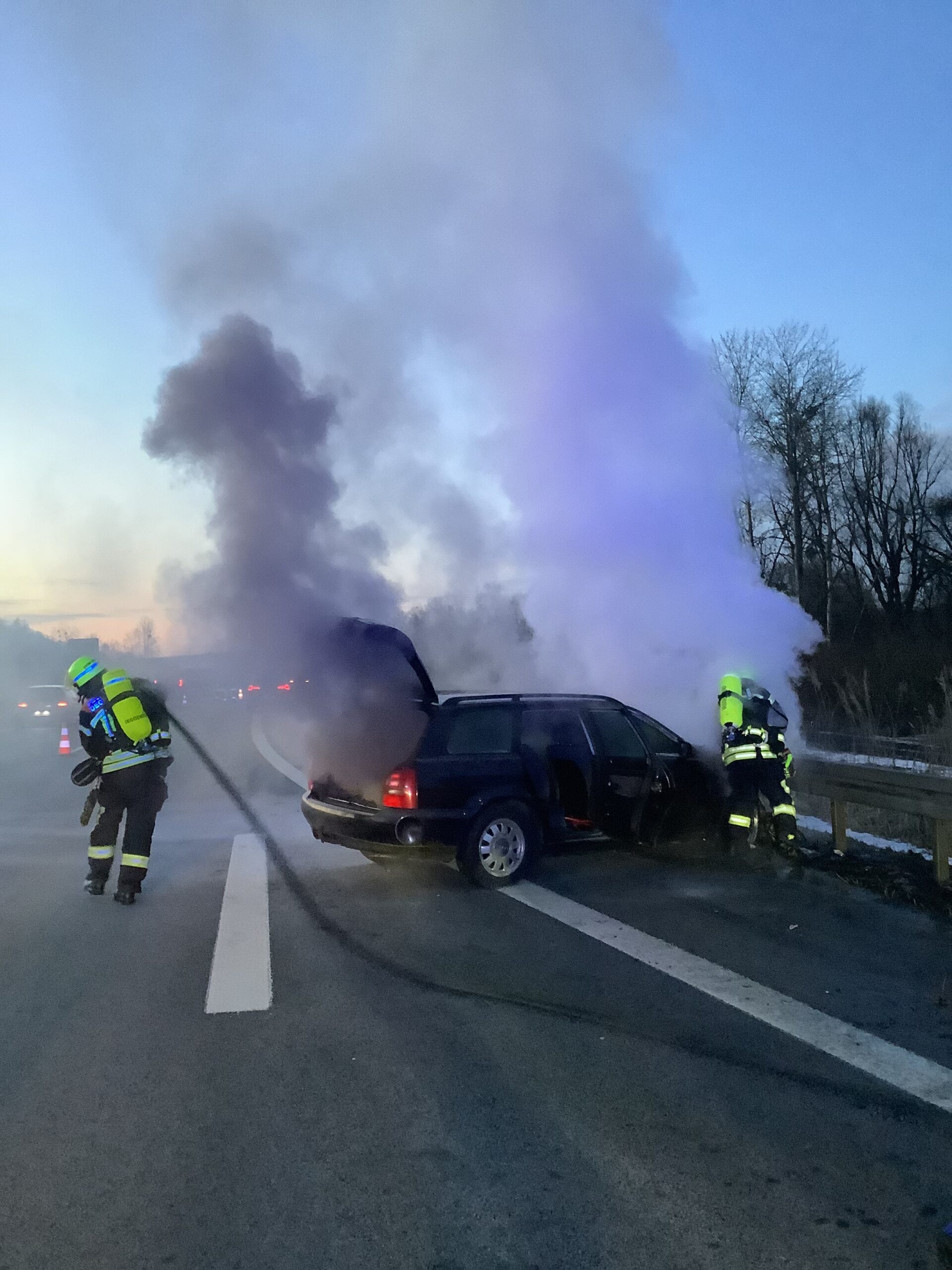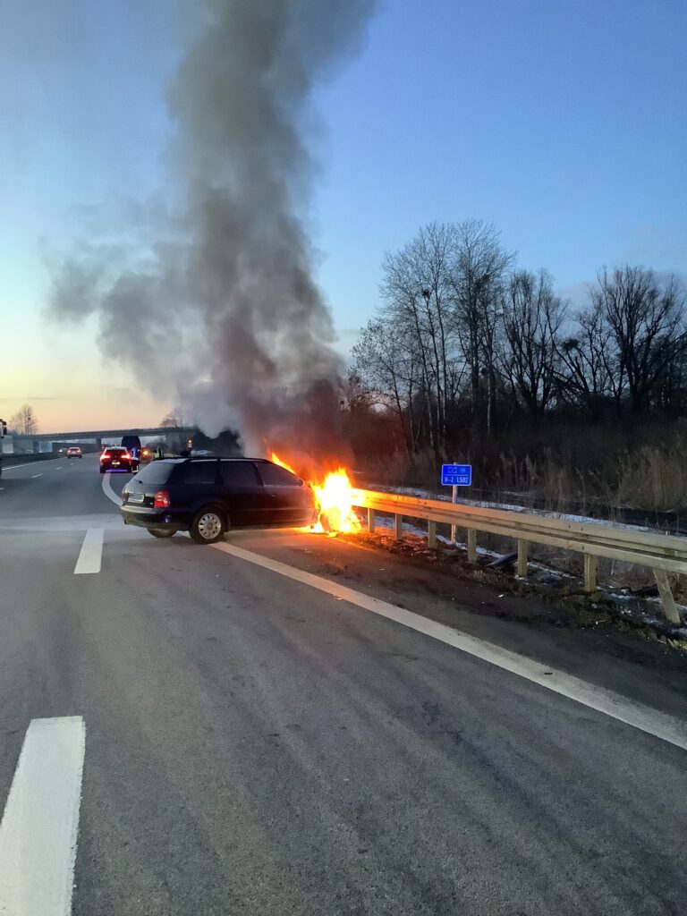 Gegen Freitagabend wurde die Mannschaft zu einem brennenden Pkw auf der A3 zwischen dem Autobahnkreuz Deggendorf und Metten alarmiert. Bei Eintreffen der Einsatzkräfte stand der Motorraum des Fahrzeugs bereits in Vollbrand. Umgehend wurde unter Atemschutz mit dem Schnellangriff die Brandbekämpfung eingeleitet, während parallel die Verkehrsabsicherung aufgebaut wurde. Um sich einen besseren Zugang zum Brandherd zu verschaffen, wurde die Motorhaube mittels Spreizgerät und Halligan-Tool geöffnet und das Fahrzeug nach erfolgreichem Ablöschen mit Schaum bedeckt. Der Brand konnte nach kurzer Zeit unter Kontrolle gebracht werden.