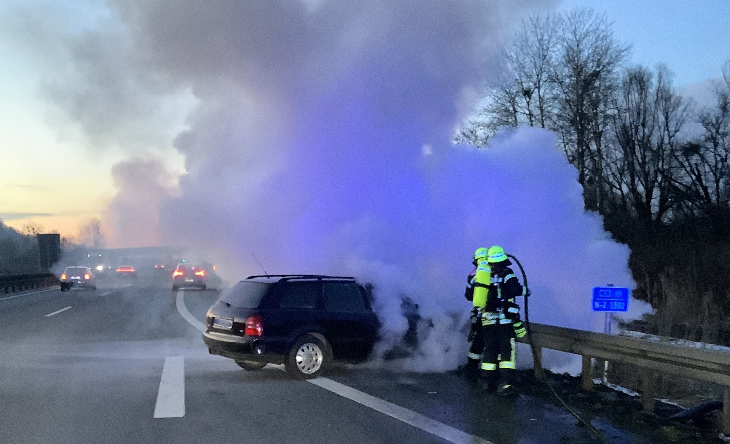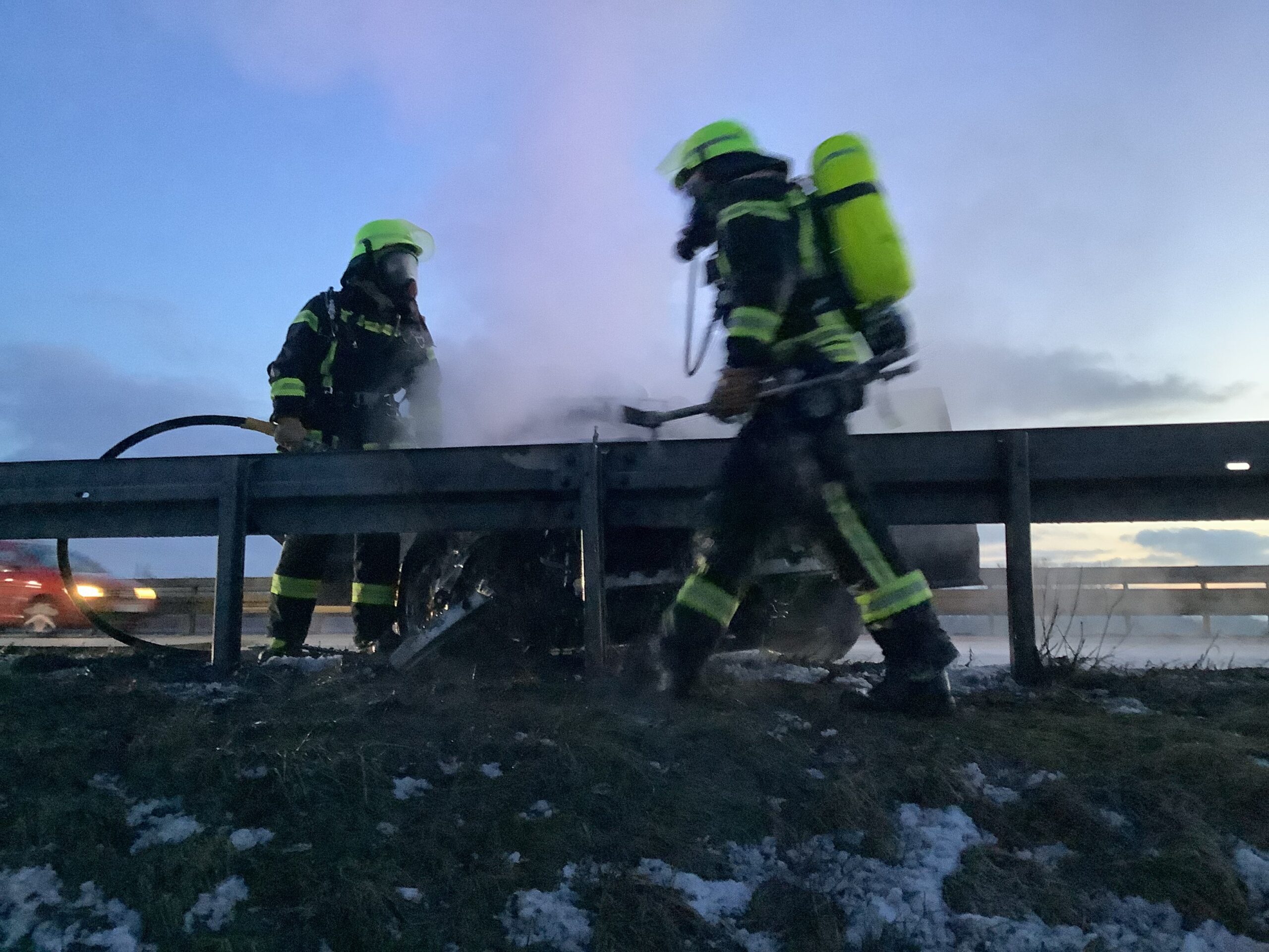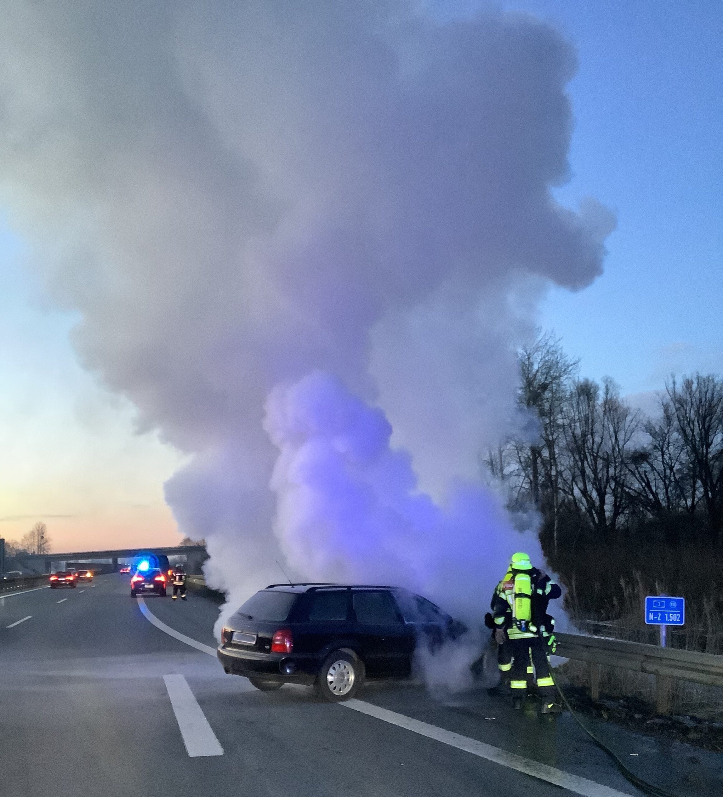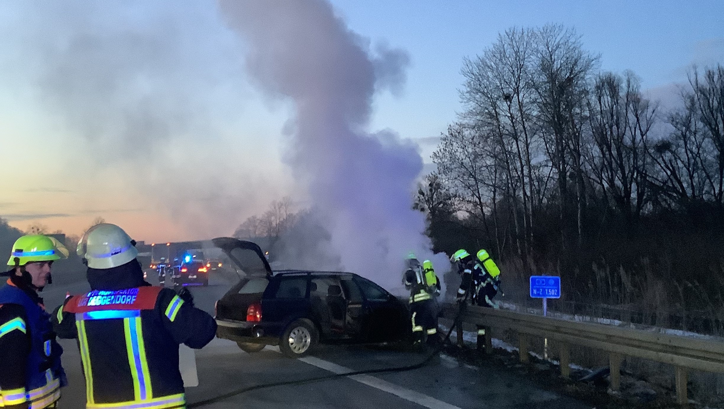 Gegen Freitagabend wurde die Mannschaft zu einem brennenden Pkw auf der A3 zwischen dem Autobahnkreuz Deggendorf und Metten alarmiert. Bei Eintreffen der Einsatzkräfte stand der Motorraum des Fahrzeugs bereits in Vollbrand. Umgehend wurde unter Atemschutz mit dem Schnellangriff die Brandbekämpfung eingeleitet, während parallel die Verkehrsabsicherung aufgebaut wurde. Um sich einen besseren Zugang zum Brandherd zu verschaffen, wurde die Motorhaube mittels Spreizgerät und Halligan-Tool geöffnet und das Fahrzeug nach erfolgreichem Ablöschen mit Schaum bedeckt. Der Brand konnte nach kurzer Zeit unter Kontrolle gebracht werden.